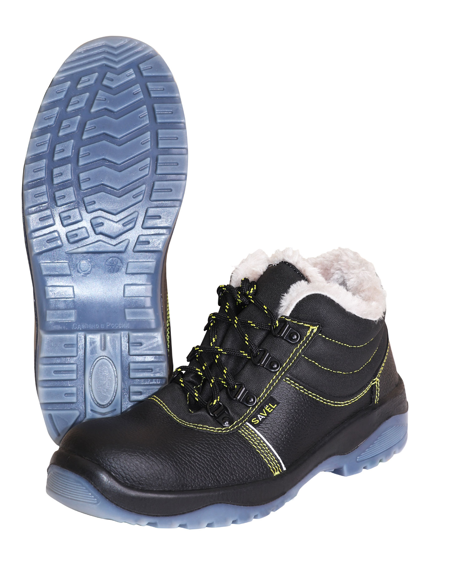 Подклад в утеплённых ботинках серии "SAVEL-Профи" серого цвета и выполнен из искусственного меха. Верх ботинка имеет контрастные отделочно-скрепляющие строчки жёлтого цвета.