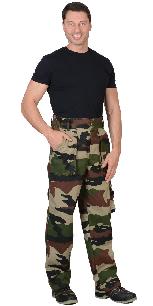 Брюки прямые, с застёжкой спереди на 3 петли и 3 пуговицы, на притачном поясе, частично стянутым на эластичную тесьму и застёгивающимся на 2 петли и 2 пуговицы. Брюки с накладными, объёмными карманами на передних половинках и на левом боковом шве, задние половинки с двумя фигурными накладными карманами. Тк."Рип-Стоп", ВО, 65% п/э., 35% х/б, 215г/кв.м. ГОСТ 12.4.280-2014