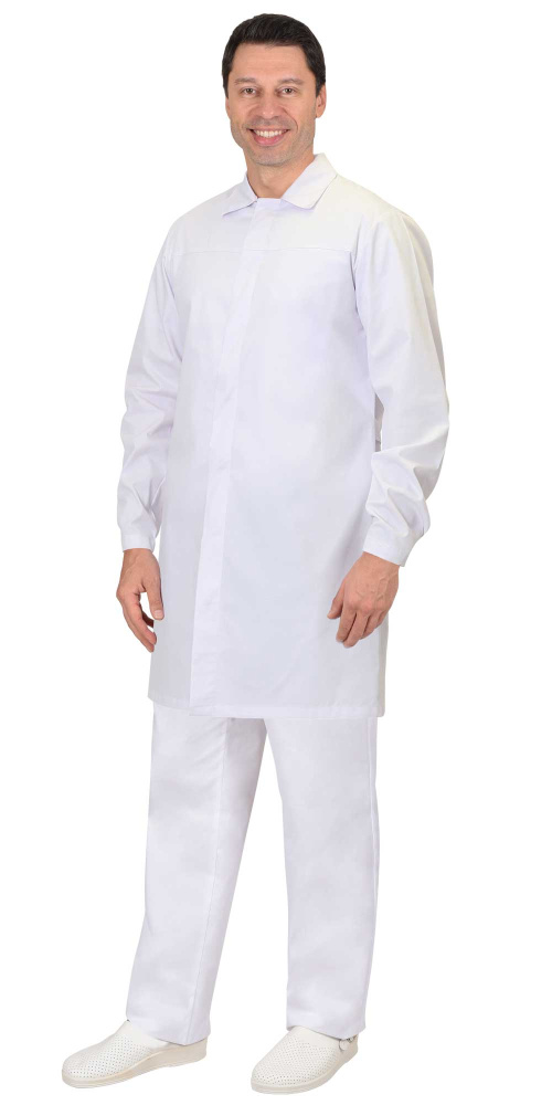 Халат мужской прямого силуэта с длинными рукавами, центральной застежкой на потайные кнопки и втачным отложным воротником. Внутренний нагрудный карман и внутренний карман на правом рукаве для пропуска.