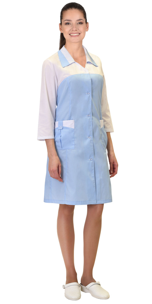 Халат полуприлегающего силуэта, с центральной застёжкой на 5 петель и пуговицы, с отложным воротником, с нижними накладными карманами с фигурными планками. Рукава 3/4. Цвет отделки: Голубой