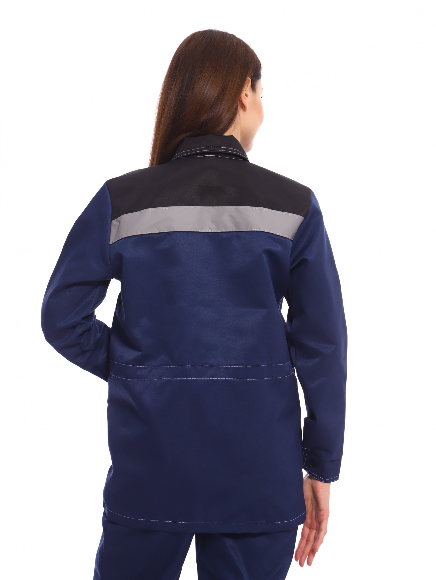 Куртка с супатной застежкой на пуговицы, со светоотражающим кантом спереди по кокетке и полосой на спине. Брюки с боковыми и задними карманами.