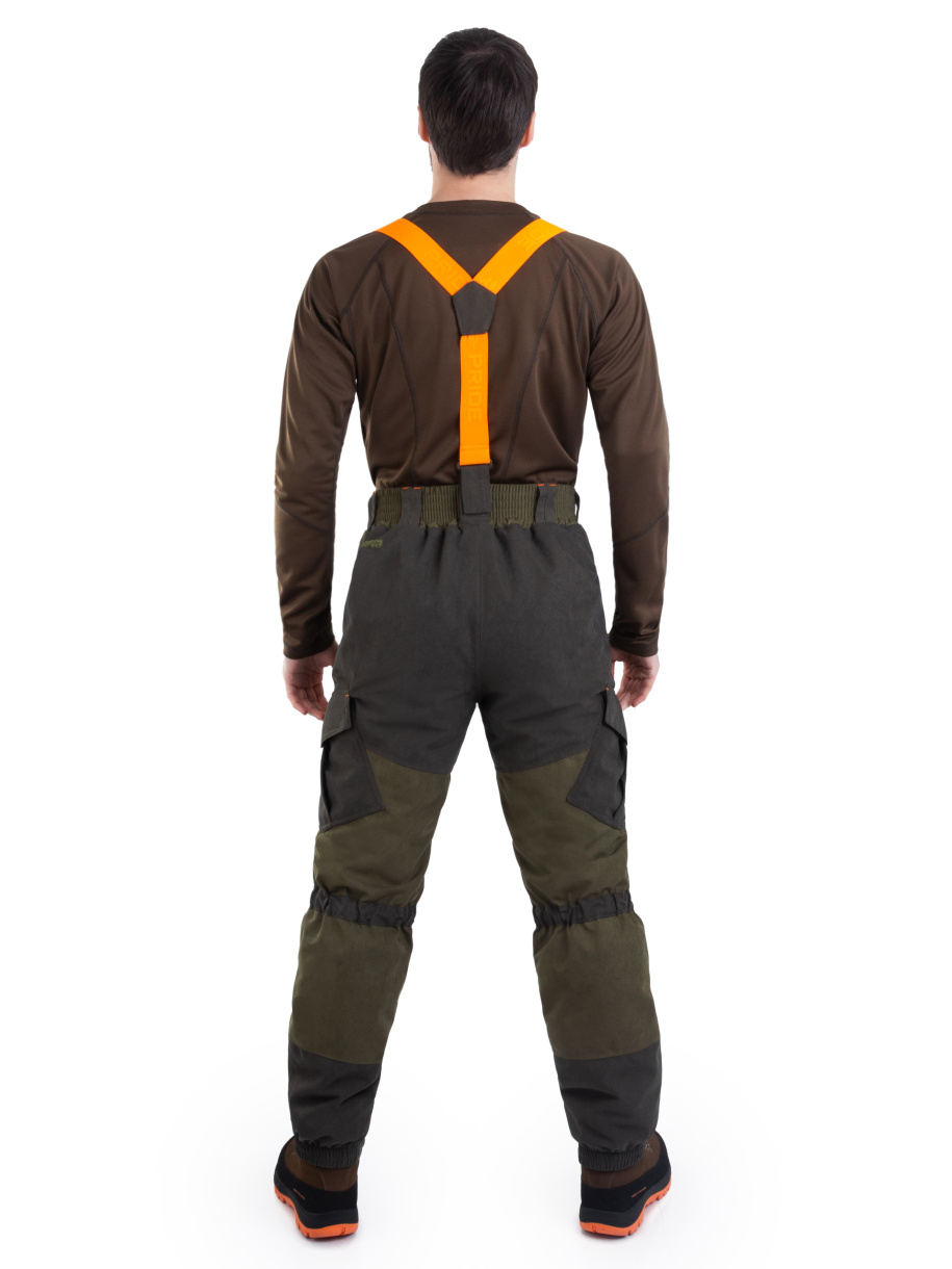 Брюки на широком поясе со шлевками для ремня. Съемные подтяжки. 4 кармана. 2 на влагозащитных молниях в верхней части брюк и 2 объемных  в области бедер. Эластичные кулисы под коленом и низу брюк для защиты от проникновения холодного воздуха.
