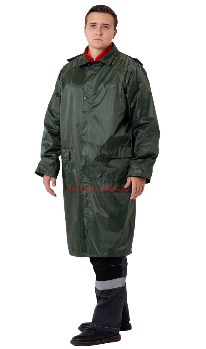 Плащ влагозащитный. Нейлон с ПВХ (100% полиэстер + 0,18мм ПВХ). Плащ с центральной застежкой на молнию и кнопки, с дополнительной ветрозащитной планкой. Воротник отложной, с капюшоном (убирается в воротник - застежка молния). Рукава втачные, с внутренними манжетами. Все швы проклеены.