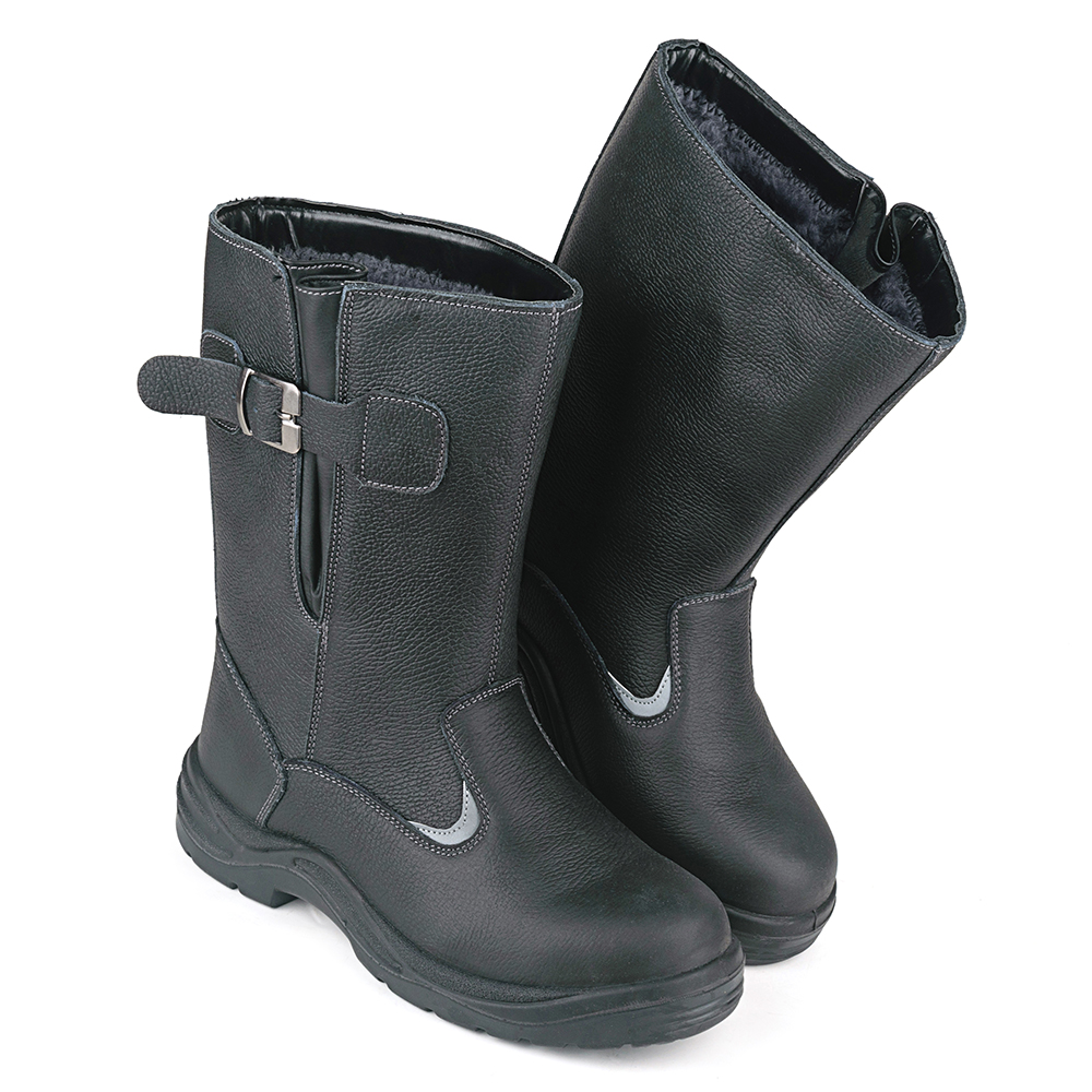 Сапоги из натуральной кожи Prosafe серии basic дополнены ремнем с металлической пряжкой для возможности регулировать и комфортно фиксировать ширину голенища. Подкладка и вкладаня стелька изготовлены из шерстяного меха. В модели предусмотрена текстильная съемная стелька. Светоотражающие элементы повышают видимость работников в темное время суток, а также на неосвещенной территории. Подошва - двухслойная, маслобензостойкая, литьевого метода крепления. Верхний слой изготовлен из ПУ с внутренней амортизирующей вставкой в пяточной части подошвы, способной гасить ударные нагрузки при ходьбе. Ходовой слой- износостойкая термостойкая нитрильная резина, способная защитить стопу от кратковременного контакта подошвы с нагретой поверхностью до 300°С. Глубина протектора ходового слоя обеспечивает хорошую сцепляемость с поверхностями и препятствует скольжению за счет рельефа протектора. Композитный подносок обеспечивает защиту пальцев стопы от механических повреждений ударной прочностью до 200Дж
